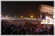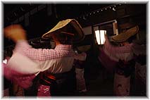 | 10月2日(土) 月見のおわら 八尾で月見のおわらが行われた。近畿日本ツーリストの旅行商品であるが、一般のお客も鑑賞可能。あいにくの雨で、井田川沿いの町民広場の特設ステージで行われる。すぐ横に観光バスが待機しているので、疲れたらバスに戻り休憩して、また出てくることも可能。そうはいっても、雨に濡れたお客様は一旦戻るとそのままということであったかもしれない。最初から最後までみていた人は少なかった。藤棚の下を流したのはよい演出でしたが、踊り手が水をはねながら踊っていたのは可哀想でした。空間づくりにもっと工夫が必要だ。五箇山のように、客席を覆う仕組みも考えるべきかも。雨天の場合も、街を歩いてもらうのであれば、おわらを感じられる場をもっと街中に設けてゆくことが大切ではないか。月見のおわらは3日の晩も行われる。街流しが観られる事を祈っていよう。 | ![]() 大勢のお客様とステージ |