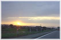 | 10月13日(水) 夕日 井波からの帰り、夕日がきれいであった。富山方面からの帰り、石川県との県境にある山の端に沈んでゆく夕日が眺められることが多い。朝は立山連峰から登る朝日も美しい。それでも、印象に残るのは夕日ではないか。能登有料道路から眺める日本海に沈む夕日も美しい。去り行くものが最後に大きく輝いて見せているようで、いとおしく感じるのは私だけであろうか。自然の変化に何事かを感じ取る、そのような暮らしを続けたいですね。そして、北陸はそのようなことが日常的に可能な場所です。もっと、自然を感じることを心掛けたい。 | ![]() 沈みゆく夕日 |