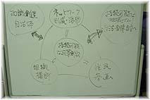 | 10月8日(金) 図を描く 自治研修センターの政策形成研修の3回目。模造紙に政策をまとめていただき、プレゼンを行う。5日間もかけて行ってきたが、一つの政策だけをまとめるのでなく、3回5日間かけるのであれば、3つの政策を創る事にしたほうがよいかもしれない。どのみち研修として行うのであれば、発想方法、考え方、まとめ方をしっかりみにつけていただくことを優先すべきでしょう。研修から活かせる政策を導き出そうとしても無理があるように思う。そのためには、別途政策プロジェクトを設けるべきではないか。それと図解することの意味を考えていただくとよい。構造を理解し、認識を共有するためにも、普段から仕事の仕組み、意義を図解してみることだ。 | ![]() 最後の講義での図 |