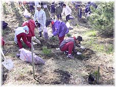 | 3月21日(月) 白砂青松の森づくり 羽咋の千里浜と能登有料に挟まれた場所に松を植えに行く。羽咋郡市の小学校の子供達も参加。700本余りの樹木を植えたが、参加人数も200人くらいはいたのではないかと思うくらいですので、作業は1時間もかからなかった。掘りやすい砂地だったので作業も楽でした。このエリアでは3年連続であるが、初年度に植えたものは少し目立ってきた感じで、昨年のものは枯れた草と同じ程度の大きさ。10年すれば少しは大きくなった感じがするでしょうが、暴風林として機能するためには10年単位の年月が必要だ。地道に植え続け、世話をしていくことが大切です。市長や教育長をはじめ、石川の森づくりの会員の皆さんもお疲れさまでした。 | ![]() みんなで植樹を |