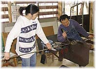 | 3月30日(水) 吹きガラス体験 吉野谷の内藤広宣・紀子さん御夫妻の工房・蕾で吹きガラス体験の様子を取材。最初から最後まで、体験者が主体となった体験教室になっています。お二人で1時間半ぐらいかけて行っていました。お一人が5回目という経験者だったので余計早かったのでしょうが、それでも1時間もかけずに一つの作品ができるのはすごい。体験された人も自分で作ったという記憶が残ると思います。ご夫婦でサポートされていて、手間のかかる仕事ですが、お一人2800円〜は安い。もっと高くてもよいように思う。保険が掛けられないそうですが、あれだけきめ細かくフォローしていただければ、めったなことはないでしょう。一度体験してみたいメニューですね。午後は能登空港でANAスタッフの嶽(だけ)さんのお話をうかがう。定住のホームページに掲載の予定です。 | ![]() ご夫婦で模範を示す内藤さん |