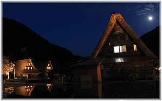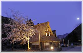 | 4月23日(土) 月と桜と合掌 夕方から五箇山の菅沼集落で過ごす。先日より桜の開花がすすみ、一段ときれいになっています。資料館の横の桜2本はこれからです。山の端にまんまるい月があがり、青い空に映えます。絶好の撮影日和で、カメラと三脚を抱えた人が多かった。与八で天ぷらうどんをいただき、荒井さんの店でコーヒーをいただく。明るいうちから、完全に暗くなるまでいたが、遅くまでお客さんが訪れていました。ライトアップは8時が目処になっているが、お客さんがいる間は点灯しているようだ。そこが小さな集落のいいところかもしれない。ただし、ライトアップの仕方をもっと工夫する必要があります。カメラにライトの強烈な光が入る場所が多かった。せっかくの桜がライトの光が明るすぎて飛んでしまいます。さらに、集落の中をもっと美しくしていけるといいですね。そうするとそこに住んでいる人も気持ちいいはずです。他所の人間もお手伝いできる仕組みを作りたいものです。 | ![]() 月と桜と合掌の館 ![]() 暗くなって |