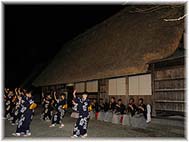 | 4月16日(土) 四季の五箇山・春の宵 午後、富山に行く。松川での遊覧船の様子をみたかった。すでに散り始めた桜の花吹雪が舞う中、遊覧船がゆっくりと松川をいったりきたりする様は絵になっていました。富山城址公園の花も満開で花見客がいっぱいでした。その後、五箇山に向かうが、桜はまだでした。つぼみが開きかけた木もありましたので、来週末にはきれいな桜の花が咲いていることでしょう。夜は五箇山インターを下りて直進するとたどりつく合掌の里で民謡披露を拝見する。四季の五箇山・春の宵のスタートの日のイベントであるが、もっと魅力的な場にできうる事業です。春の宵の最終日・5月14日には、おわらとの競演も予定されています。食談議もあります。 | ![]() 民謡披露 |