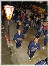 | 4月9日(土) 金沢でおわら 浅の川園遊会に越中民謡おわら保存会の皆さんが出演された。浮き舞台での公演の後、東茶屋街で街流しもありました。街流しの前後に、八尾の皆さんのところにお邪魔したが、さすがに寒かったようで、酒がすすんでおられました。昨年同様、箔座ひかり蔵の2階から眺めさせていただきました。金沢から八尾に通い続けている長井御夫妻と八尾・上新町の「つどい・おかめ」の谷井昭美さんも一緒でした。ご主人は胡弓をひいて街流しに参加しておられました。最後には谷井さん、長井御夫妻にひかり蔵の2階で踊りの手ほどきもしていただく。程よいお客様の数で、八尾から来られた保存会の方々も楽しんでいただけたようで何よりでした。八尾の皆さんをお見送りした後、茶屋街にある「まいまい」という店でメディアプロデューサーの金森千栄子さん、金沢工業大学の水野一郎さんたちと楽しい一時を過ごす。フードピア金沢の最初の頃の企画会議のようでもあった。 | ![]() 東茶屋街でのおわら |
