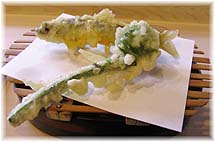 | 4月3日(日) 春を味わう 昼は石亭で天ぷらをいただく。目の前で揚げていただけるカウンターコーナーが設けられています。ささやかながら、4月下旬に高知に旅立つ吉村さんの送別会を浅田屋の大谷さんとしました。由布院で出会った学生インターンが縁で知り合ったのですが、地域づくり推進協議会の運営委員もしてもらいました。金沢大学の助手を辞めて農業を始めるというのが面白い。由布院に研修に行っていた角谷明美さんも農家の嫁になりましたから、新しい流れかもしれませんね。土に足をつけ、生き物と一緒に生きていることを実感できる仕事は人生を豊かにしてくれるはずです。 | ![]() 稚鮎の天ぷら |