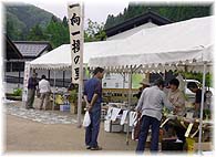 | 6月5日(日) ふれあい市 白山麓でふれあい市が行われていたので、様子を見に行く。鳥越村の道の駅に最初に行く。来春からは常設の直売場ができる予定であり、来月からそのプレ事業として市を毎週開催していただこうと提案しているので、どの程度商品が集まり、お客様がどれくらい来ているか気になるところです。白山市になって最初のふれあい市だったが、広報もあまりされていないようで、お客さんの入りは少ないようでした。しかし、商品はいろんなジャンルのものが集まり、手打ちそばもあって、それなりに魅力的です。元気よい女性達が多い。直売場が出来ても彼女達の頑張りが大切です。吉野谷の工芸の里、河内のめおと岩温泉前、鶴来の道の駅ものぞいてきた。集積効果で競い合いながら集客力を高めていくことが大切です。 | ![]() 鳥越のふれあい市 |