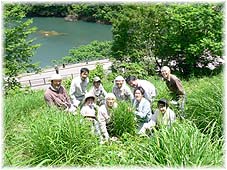 | 6月12日(日) 茅場下草刈り 五箇山・菅沼の荒井さんの茅場の草刈体験に出かけた。5月にカタクリの花を見に行ったところです。すでに茅が1mぐらいに成長し、その間にいろんな草や小さな木が生えていました。茅の株の間はカマで刈り、株の中に生えているわらびや巻きついている葛のつるは手で取り、茅だけを残します。秋には、茅刈り体験が出来そうです。7月には荒井さんの会社の事務所にしている建物の屋根の半分を葺き替えるそうです。正味1時間程度の草刈でしたが、天気も良くて沢山汗が出ました。昼食は荒井さんの自宅の座敷でよもぎ入りそば、山菜料理やおにぎりなどをご馳走になりました。五箇山森林組合には若手が15人ほどいるとのこと。茅葺き職人として仕事が結構あるようです。横浜から来たという沼口さんは移住して10年。最初はIターン者が多かったが最近は地元の若者が就職しています。森林組合のいいモデルですね。 | ![]() 草刈後の記念写真、手前にあるのが茅の株です |