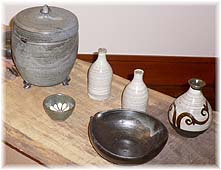 | 6月23日(木) 金京徳陶展 井波に行った帰りに、城端のじょうはな織舘で行われていた金京徳陶展を拝見した。ちょうど奥様も会場に姿を見せておられました。韓国の生まれで、お兄さんについて修行した後、来日。福井の越前陶芸村の古川重山先生に師事。2000年に奥様の故郷・井波に窯を開き、創作活動を続けています。1970年生まれですから、まだ若い作り手です。展示されていた作品も手ごろなものから大きな作品までバリエーションに富んでいましたが、試しに使って見ようと思わせられるものでした。冷麺鉢とマグカップを購入。 | ![]() 展示の様子 |
