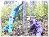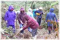 | 10月29日(土) 間伐体験 能登町の道の駅・桜峠に集合し、杉林の間伐体験を行う。能登町の漁民の方々や女性林業研究会のメンバー、一般参加の方など総勢39名で体験を実施。あいにくの雨であったが、6つのグループに分かれ、1グループが30本の杉林の中から曲がったものや生育の良くない3本を選んで間伐を行う。斜面での作業は大変でしたが、貴重な体験でした。既に枝打ち間伐を実施した杉林でしたので、下層植生も豊富で土壌は安定しており、腐葉土も十分あるように感じました。杉林などの人工林も間伐することで、保水力、土壌保持力、養分供給力も高まります。そのことへの認識を広めていくことが重要です。昼食の後、女性林業研究会の皆さんとお話できたことが大きな成果でもありました。お世話いただいたのと森林組合の皆さん、ありがとうございました。 | ![]() 間伐体験 |