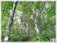 | 10月9日(日) 能登のブナ林 午前中から、石川の森林50選に選ばれている奥能登のブナ林を見てまわった。柳田と輪島の境にある鉢伏山が最初。頂上付近にブナ林が点在しています。ブナ林の中を歩くようにはなっていないが、尾根の両側に生えているブナを見おろすことも可能です。次に珠洲市の宝立山に行く。トンネルの上に上がる道路があり、そこを登っていくと、両側にブナ林が点在しています。ブナが両側にきれいに生えたゾーンがあり、歩いてみると心地よい。最後に、輪島の高洲山に行く。2つのルートがあるが、一方は自衛隊が管理しているので、小さな石柱が立っているところから登った。頂上には自衛隊のレーダーが設置されているし、工事も行われていたが、手前にあるお宮の裏山一体がブナ林になっています。林内には遊歩道も整備されており、最も歩きやすい。ブナ林を歩く旅を企画するには十分なフィールドです。夕方から門前で、地域づくりの分科会の打ち合わせ。そのまま、まんだら村の「有限会社のと」で懇親会、宿泊。 | ![]() 高洲山のブナ林 |