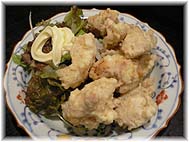 | 10月26日(水) 由布院へ 地域づくり情報誌の巻頭座談会として、静岡の田中さんを囲んで、コーディネーターの赤須さん、濱さんと議論。その後、田中さんと一緒に、小松空港から福岡へ。空港で田中さんとわかれ、夕方には由布院に到着。由布山荘にチェックインし、観光総合事務所へ。由布院に来られていたご客人と、井尾百貨店の井尾社長、米田さんと茄子屋(川上1503-6 TEL0977-85-3314)へ。豪勢な鍋や名物料理のとり天などをいただく。いずれも美味しい。その後、井尾さんのご自宅へ。パラゴンというりっぱなオーディオでクラシックを拝聴。球磨焼酎を一通り飲ませていただくが、10年ものの古酒はさすがに美味しい。 | ![]() 名物料理・とり天 |