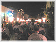 | 10月1日(土) 月見のおわら 月見のおわらが行われた。クラブツーリズムのための企画事業であるが、一般のお客様も十分見られます。早めについて、町内を見て回り、風庵でそばをいただく。その後、おおつか茶舗で中国茶を楽しみながらおわら談議。最初の町流しが終わった後、諏訪町通りに入り、風庵の前でご主人達と東町のおわらを拝見した。おわらは「ああだ、こうだ」と批評する地元の人々に鍛えられて上達するものなのでしょう。その後、通りを上がり、観光会館の前で行われていた踊り方教室の様子を見るが大勢の人が踊っていました。最後に諏訪町通りの坂の上の方で鏡町のおわらを拝見。町内によって雰囲気が違うことがよく分ります。いつものことながら、終わりの時間帯に坂の上の方に来ると人は少ない。 | ![]() 月見のおわら |