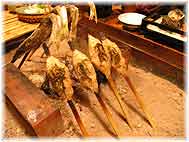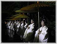 | 11月11日(金) 出雲へ 今年も島根県出雲総務事務所に呼んでいただきました。出雲市駅に午後6時半に着いたので、総務事務所の大田さん、松江の松浦さんと大社の稲佐浜で行われていた神迎えの神事を見学に。あいにくの天気であったので、神迎えの道での行列はなかった。それでも、神事に向かう神官たちの行列を拝見することはできました。浜での神事は見られそうになかったので、途中で帰ってきました。神々がやってくる時は、風が吹くか雨が降ると言い伝えられているようであるが、その通りの天気でした。出雲にもどり、駅前の飲食街にあるてんぷら屋・てんてん亭で遅い夕食をご馳走になる。 | ![]() 神迎え神事 |
