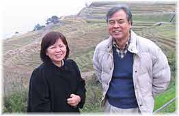 | 11月28日(月) 能登めぐり さんなみで美味しい朝食をいただいてから、能登をご案内する。千枚田を眺めてから、輪島の朝市へ。月曜日だというのに、あまりの人の多さに驚く。輪風庵でお茶をしてから、門前へ。総持寺を拝観して、手仕事屋でそばをいただく。最後に富来の増穂浦で桜貝を拾っていただく。途中、志賀町の能登有料近くの集落を通り、ころ柿が干されている風景を眺める。季節の風物詩です。小松空港までお送りして、2月の再会をお約束する。2月には沖縄で地域づくり団体全国研修交流会があります。やんばる自然塾のある東村でも、分科会が予定されています。 | ![]() 千枚田と島袋御夫妻 |