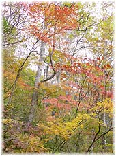 | 11月6日(日) とが谷のブナ林 白峰に向かう途中にとが谷のブナ林はある。手取ダムのあるところからさらにトンネルを5つ抜けて左におりると神社があり、そこから、遊歩道が設けられている。林道に一旦あがり、さらに少し下ったところから、ブナ林に上がるルートがある。ここは山一帯にブナが生えており、他の広葉樹や杉も混在している。大きなものから小さなものまで、斜面がきついので、根曲がりになっているが、逞しく生きてきたことを示しているようだ。紅葉の進んだ森は、気持ち良い。あいにくの雨模様で風も強かったが、20名近くのブナ林散策の参加者もお楽しみいただけたことでしょう。主催していただいた白山里の山菜めしも美味しかったし、神社の杉の大木の根元で作っていただいたきのこ汁がまた美味しかった。恒例の催しにしてほしいという感想を多くいただいたので、白山里として継続的に実施してほしいものです。白山麓で森を歩くツアーを定着させることが当面の目標ですね。 | ![]() 紅葉したブナ林 |