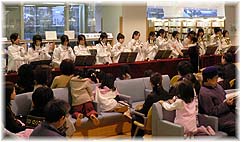 | 12月23日(金) 図書館 図書カードを再発行してもらうために泉野図書館に行く。一旦仮の用紙を発行してもらい、次回に正式なカードを渡すという仕組みです。この意味がよく分らない。もう一度探すようにという意味なのか、その間に、データを再確認するということなのか、二度手間のように感じるこの仕組みの意味の説明があるとよい。とにかく、再発行してもらい、本を見て回り、書店ではみたことのない本を3冊かりうける。たまに図書館に行くと、新しい発見があるものです。新たな知識に出会う貴重な場ですね。ちょうど、館内では、北陸学院の生徒達のハンドベルのコンサートが行われていました。生演奏はいいものです。 | ![]() ハンドベルの演奏 |