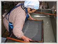 | 12月9日(金) 加藤和紙 朝、加藤和紙(能美郡川北町中島 〒923-1252 TEL 076-277-5800)に電話したら、今日は作業をしているとのこと。早速出掛けて紙漉きの様子を撮影させていただく。冷たい水の中での作業が繰り返されますが、漉いた紙の水を落として、きれいに並べる作業等もあるので、まだいいのかもしれない。一番大変なのは、一旦砕いた材料からゴミを取る作業かな。水の中に入れて、一つひとつゴミを取ってゆきます。途中、そばにおいたお湯で手を温めながらの作業が続きます。地味ですが重要な仕事です。和紙はもっと高くてもいい商品ですね。母屋から作業場に行く際に和傘を貸して下さり、それをさして移動。雰囲気があり、面白い演出です。加藤さんのお母さんは魅力的な人です。 | ![]() 紙漉き |