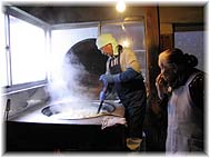 | 12月1日(木) 松波飴 内浦の松波に「松波飴」の取材に訪れる。横井商店が唯一、飴を作り続けておられます。おばあちゃんもお元気で、作業のチェックと店番をされています。釜場は湯気がたちのぼり、美味しいにおいが充満しています。途中の飴を冷やして丸めたものをいただくが、柔らかくて美味しい。お菓子としてなめるだけでなく、料理に砂糖と味醂の代わりに入れると、魚は煮崩れしないとのこと。風邪をひいたときに、大根のスライスしたものを器に入れ、飴を入れておくと、大根のエキスがしみ出してきて、飴と混ざります。大根がしおれてきた感じになったところで、そのエキスを飲むと良いそうです。こんな活かし方もあることを教えていただくと大きな器のものを買ってもいいかなと思いますね。 | ![]() 親子で飴を炊く |