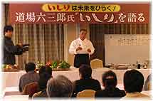 | 12月4日(日) 道場六三郎氏いしりを語る 昼前から能登町の宇出津商店街で寒ぶりの解体即売が行われ、予定の10本を上回る16本の寒ぶりを解体した。ちょうど天気も良くなって、イベント日和でした。片身を買っていかれるお客さんもいて、寒ぶりの人気は大したものです。夜は、コミュニティセンターで道場六三郎氏にいしりについて語りながら、料理の実演をしていただき、試食を楽しませていただく。能登の調理人さんを中心に70名が参加。料理の仕方についての細かい質問も出て、今後に期待を持たせる内容でした。能登の飲食店や宿泊施設では必ずいしりを活かしたオリジナル料理があることが当たり前になって欲しいものです。地域性を活かした料理が付加価値になるはずです。さすがに料理の鉄人は話も面白く、魅力的な場を演出して下さいました。 | ![]() ステージ上での道場さん |