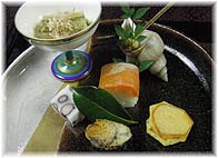 | 12月21日(水) 忘年会 石亭で事務所の忘年会があった。久し振りに2階に上がりました。リクルート時代に忘年会を行ったこともありました。1階で食事をしたことも何度かあります。2階にはべんがら色の壁の部屋と群青色の壁の部屋があります。群青色の壁の部屋でご馳走になったが、縁側がついていて雪見障子越しに見える中庭が料亭らしい雰囲気を醸しています。オーソドックスな料理を楽しみながら、ゆっくりした時間を過ごすというのもいいものです。 | ![]() 最初の一皿 |