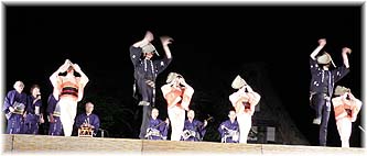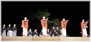 | 5月20日(土) 春の五箇山 四季の五箇山・春の宵のライトアップと民謡競演を拝見に五箇山に行く。留学生のお二人をご案内する。台湾のテレビドラマの撮影が続いているということで、その現場にも入れていただく。五箇山観光協会の山崎さんの配慮で、喜んでいただけました。舞台では、おわらと五箇山民謡の競演が1時間ほどあり、その後輪踊りが行われ、お二人にも参加いただく。金沢の長井さんの後について踊りも楽しんでいただきましたが、大学での講義の際にも民謡の踊りを習ったことがあるとのことでした。昼も兼六園に一緒に行き、携帯でのガイドのテストを行いました。彼女たちに試していただくだけで、問題点は沢山でてきました。改良を加えないといけませんね。次は五箇山バージョンを作りたいものです。 | ![]() 舞台での民謡披露 ![]() おわら保存会の皆さん |