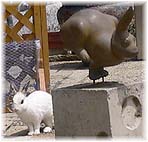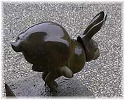 | 5月28日(日) 二兎 雨の中を加賀に向かう。途中、晴れてきたので、うるし蔵に立ち寄り、うさぎの様子を拝見する。たしかにうさぎが庭に放されていました。おまけに外まで出ているうさぎもいて、ハラハラさせてくれます。それでも自分の領域をわきまえているのか、自分で戻っていきました。お客さんたちは、中庭にいるうさぎたちについて最初は不思議な感じを持つようですが、そのうち近寄ってきて接触を試みます。うさぎの像が置いてある近くに、本物のうさぎがいる様子が面白いですね。その後、竹の浦館での小泉武夫さんの食育についての講演会に行く。手が足りないようだったので、急遽受付を手伝う。会場から人が溢れる盛況ぶりでした。関心が高いあらわれでしょうか。小泉教授の話はたしかに分かりやすくて面白い。最後に言われていたのは、何を食べるかであるが、海草、根菜、魚、大豆、ご飯の5つが重要であることを強調されていました。 | ![]() うるし蔵のうさぎ |
