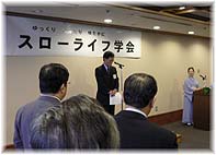 | 6月6日(火) スローライフ学会 東京のプレスセンターで行われたスローライフ学会の旗揚げパーティに出席。一昨年、地域づくり団体全国研修交流会・石川大会にゲストでお越しいただいた川島正英さんからご案内をいただいた。会長が筑紫哲也さん、学長が神野直彦さんです。ご両名ともお話をすることができました。筑紫さんとはフードピア金沢の事務局をしていた時に、ホテルで川島さんから紹介いただいたことがあっただけですし、神野先生にお会いするのは初めてです。神野先生は財政学を研究されていますし、多くの本を書かれています。政府の財政再建、景気回復、そして、地方分権を推進するために必要なことを説かれ続けています。『二兎を得る経済学』の中で次のように述べておられます。「人間は「学び」向上していくために生きている。経済成長はそのための手段にすぎない」。ホモ・ディスケンス(学びの人)という、魅力的なコンセプトを提案されています。 | ![]() 神野直彦氏と野口智子さん |