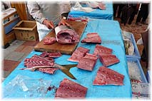 | 12月3日(日) 寒ぶりまつり 能登町の宇出津中心商店街で行われた「寒ぶりまつり」を見に行く。11時からの寒ぶりの解体・即売には多くのお客様が集まって来ていた。解体は中心市街地にある魚屋さん3軒が担当していたが、我先にと寒ぶりを求める人でごった返していましたね。一番大きな寒ぶりは17kgもありました。大きな切り身だけでなく、お頭とかあらの部分も人気です。内臓も売れるのではないかと思う。刺身は近くの紙子鮮魚店で作ったものを販売していました。商店街の魚屋さんが連携して、役割分担していることもいいですね。商店街では地元の皆さんの屋台もたくさん出て、その場で食べられるようにテントも多く用意されていました。雨が降ったり、あがったりの変な天気でしたが、沢山の人がテントの下で飲食も楽しまれていました。今後も継続して行っていただきたいものです。なお、1月15日まで、町内の飲食店や宿泊施設で寒ぶり料理を味わうことができる「能登の寒ぶりまつり」も実施中です。 | ![]() 寒ぶりの解体・即売 |
