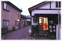 | 12月8日(金) 醤蔵(ひしおぐら) 夕方、大野の醤油蔵に行った。当社が長年デザイン等をお手伝いしているヤマト味噌醤油のショウルーム「醤蔵(ひしおぐら)」である。大野は金沢港に面した地区で昔から良質な水があることと、港から物資を入れやすいこともあり、味噌醤油を製造している蔵が多い。その蔵の一部を改装し、お客様に遊びに来ていただこうと始めたものであるが、醤油ソフトが人気で、若いカップルなども多く訪れているようだ。それに伴い商品も売れているので、それなりの売上が上がっている。ささやかではあるが、人を引きつけるポイントとして地域の中では重要な役割を果たしている。 | ![]() 醤蔵の夕景 |