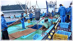 | 12月22日(金) 宇出津港 朝早く家を出て能登町に行く。9時前に着いたので、港に行ってみた。すでにセリは終了していたが、荷揚げをしている漁船が1艘いたので、写真をとらせていただく。小いわしのような小さな魚が多かったが、大きな魚も含まれており、選別作業に追われていました。寒い中での作業は大変そうでしたが、見学させていただくと、感動できるシーンです。セリの様子も独特の雰囲気があって魅力的です。もっと漁港を活かしたいものですね。 | ![]() 魚を水揚げする |