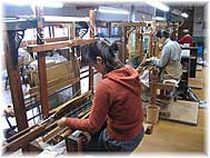 | 1月19日(金) 能登上布 午後から中能登にお邪魔して取材を続ける。最初に訪ねたのは高澤醸造近くの山崎仁一さんの工房です。能登上布を専業とされている唯一の工房です。3年前に息子さんが戻ってこられて、跡継ぎとして仕事に励んでおられます。ご主人は高齢ですがお元気で、仕事の管理監督者として後進の指導にあたっておられるという感じでした。工房には若い女性たちが働いています。新たな担い手として能登の人だけでなく千葉からも来られています。高機での織り作業も4名の方がされていましたが、スピードが違いますね。さすが専業の技は高い。新たなデザインも毎年作られるそうです。今後に期待できます。次に、とんぼ玉を作っている待寺さんを訪ねる。京都から鹿島に移り住んで、農業をしながらとんぼ玉を作っているユニークな存在です。農業を続けながら創作活動を続けられたいとのこと。面白い人はまだまだいるものです。 | ![]() 能登上布を織る |