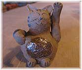 | 1月16日(火) 能登島 和倉温泉から大きな橋を渡ると能登島です。なだらかな丘陵地が広がり、入り江のところに集落が点在するのどかな島だ。ここには他所から来た人が多くいます。ガラス工房のスタッフや案山子窯の山田さん、農業をやっている高さんご夫妻、カヤックやカヌーを仕事にしている渡邊さんをはじめ、たくさんの人が移り住まれています。これらの人に共通していることはあくせくしていないこと。ゆったりとした時間の流れを楽しんでいるような方が多い。スローライフをテーマに活動しているのとカフェの仲間たちもいます。能登の中でも魅力的な存在だ。 | ![]() 案山子窯の招き猫 |