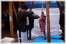| 2月15日(木) あんこう・たら祭り 能登町のまんなか市にあわせて行われた「あんこう・たら祭り」を見学。メインはあんこうの吊し切りとあんこうなべ。たらの子付けの販売も行われたました。あいにくの雪が舞う寒い日でしたが、あんこうの吊し切りは迫力があります。吊るした後、水を口から入れて、重心を安定させてから解体しますが、きれいに皮がはがれるものです。あんきもをねったみそを入れたあんこう鍋も美味しかった。夜は宇出津の「民宿ふわ」に泊まり、「風来坊」で魚をいただく。 | ![]() あんこうの吊し切り |