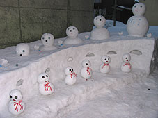 | 2月5日(月) 雪だるままつり 白峰の桑島地区で行われた「雪だるままつり」を見学に行く。その前に、一里野スキー場の奥にあるブナオ山観察舎でカンジキ体験や生き物観察を行う。カモシカは望遠鏡で見る事ができました。厳しい斜面で暮らしています。その後、白峰の集落の中をガイドの「加賀白山ようござった」のメンバーのガイドで散策も楽しむ。桑島地区は川の両側にそれぞれ集落があり、家々の前に手づくりの雪だるまが作られています。小さな雪だるまを集めた作品が最近のはやりのようで、多く見られました。雪だるまづくりの体験プログラムも欲しいところです。 | ![]() アートな雪だるま |