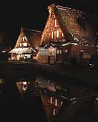 | 2月11日(日) 雪明かり 朝食後、上浦さんご夫妻を五箇山・菅沼集落にご案内する。茶房「掌」でお茶を飲み、よい具合に降る雪を眺めていただく。大きな窓から見える雪景色は素晴らしい。いつまでもじっとしていたいと思わせる風景でした。名残惜しかったが、昼の便に間に合うように小松空港までお送りする。その後、再度、白川郷と菅沼集落のライトアップを見学に行く。白川郷はさすがに人も車も多い。展望台まで歩いて上る人の数だけでもすごかった。集落の中も人であふれかえっているという感じでした。りっぱなカメラをもった年配者も多い。趣味でカメラを始められた人が多いのであろうが、ちょうどよい被写体なのだと思う。菅沼のライトアップも人が多かったが、終わり近かったので、最後には人がいなくなって、撮影しやすかった。 | ![]() 菅沼のライトアップ |