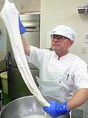 | 2月8日(木) マルガーのチーズ 能登町の瑞穂にあるマルガーは息子さんが作るジェラートアイスで有名であるが、昨年からお父さんがチーズづくりを始めています。今日はその作業の様子を撮影させていただく。モッツアレラチーズはすぐ食べられる簡単なチーズです。下準備も相当ありそうですが、最後の行程を拝見した。固形化した牛乳を切り刻んで、そこにお湯を入れてもんでいくと不思議なことに、餅のようにのびるチーズに変化していきます。この部分は体験も可能とのことでしたので、一度はやってみたいものだ。その場で試食したり、お土産に持って帰ることも可能です。マルガーの柴野親子の開発意欲は高い。 | ![]() 伸びるチーズ |