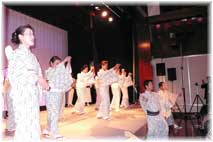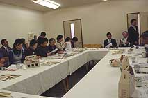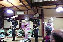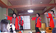 | 2月3日(土) 高山線沿線食談議 食談議の第二弾。小布施堂の市村次夫さんをゲストに、八尾の合掌で開催。開発中の特産品の試食評価をまず行う。その上で、市村さんに講演いただく。会場を移し、おわらの披露を楽しんだ後、参加者全員に自己紹介及び感想を述べていただく。その後は、自由に歓談いただくが、初回の食談議よりは盛り上がった感じがしました。宿に戻り、ささやかな二次会を行うが、市村さんといろんなお話が出来たことが最大の収穫かもしれない。 | ![]() おわらの披露 |