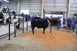 | 2月23日(金) 子牛 能登人の取材のために、子牛のせりを寺岡さんと見学に行く。寺岡さんは子牛を買うわけではありませんが、畜産の現状を把握するとともに、将来、買い付ける肉牛の素性を把握しておくためにも意義があるようで、最近は時々見学に来られるようだ。子牛を育てた農家が見守る中、肥育業者がせり落として行きます。デジタル化したシステムではせり金額が電光掲示板で徐々に上がっていき、一人になった時に止まり、そこで確定します。同じ10ケ月程度の子牛でも金額は倍以上の差がつきます。育て方、育ち方によって、大きさも毛並みもずいぶん違います。評価ポイントをうかがうと、見方がちがってきます。貴重な体験でした。一見可愛い顔をしている子牛もよく見ると鋭い目をしていることに気づいた。 | ![]() 子牛のせりの様子 |