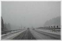 | 2月1日(木) 久しぶりの雪 午後、富山の立山町でのミーティングがあったので出かける。久しぶりの雪で高速道路上では事故が頻発していた。県境のトンネルを抜けたところで3台の車が止まっていた。乗用車2台は相当壊れていたので動かない感じであった。大きなトラックは大丈夫そうであったが、1台の乗用車の運転席の人は大きくへこんだドアの中でぐったりしていた。トンネルの出口でカーブしながらの坂道が一番危ない。気をつけて走行車線で減速しないといけませんね。富山県内は総じて雪があったが、帰ってきて、夜の会合に参加した金沢の問屋センターには雪が無かった。少しのことで大きく積雪が違う、これも事故の要因になります。 | ![]() 雪の高速道路 |