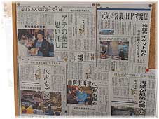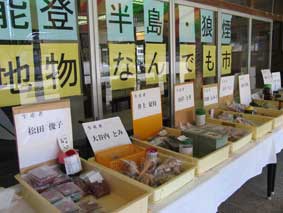 | 4月13日(金) 取材協力 当方のページをご覧になった方が東京から取材にこられたので、おつきあいする。早めに金沢を出て、穴水の海岸沿いにある「ぼら待ち市場」(穴水町根木 TEL0768-52-8222、木曜定休)に寄ってみた。地元の地区の方々10数軒で組合を作り運営されているとのこと。地元で作られている農作物や花から、骨董品的なものまである。周辺地域の特産品もあります。店内ではコーヒーを飲んだり、麺類をいただくことも可能です。もっと、地元の生鮮品が増えると魅力が増しますね。穴水役場に大霜副町長を訪ねるが、震災復興本部で連日忙しそうです。能登空港で出迎え、道の駅桜峠での取材におつきあいする。本日、能登空港から帰る大沼さんとも合流。道の駅の店内には、復興関係の記事が貼り出してありました。次に夢一輪館でそばをいただきながら、話をうかがう。みやげにしいたけをたくさんいただく。きのこの森は楽しそうである。