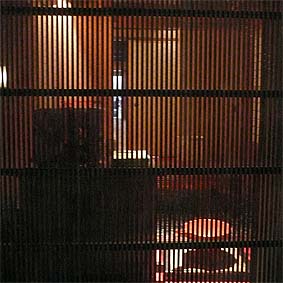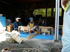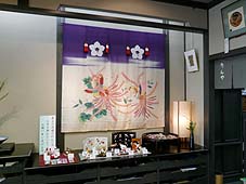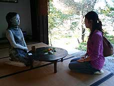 | 10月7日(日) 坂のまちアートinやつお 「坂のまちアートinやつお2007」を見学に朝から出かけた。10時過ぎに到着し、町民広場に車をとめ、歩いて石垣の坂道を上り、西町に出る。そこから右回りに会場を見て回る。40以上もある会場を1日で回るのは無理があるのだが、メリハリをつけて拝見させていただく。お店によってはお茶を出していただいたりしたところもあるので、ゆっくりさせていただきました。昼は「和布」でお好み焼きをご馳走になる。最後は駅近くの福島一区コミュニティセンターへ車で行き、島崎棟梁の話をうかがいながら、2階も含めて見学させていただきました。 | ![]() 空間にあわせて作られた作品 |