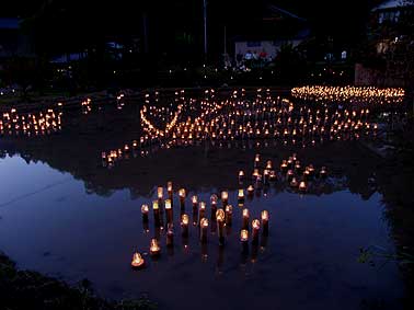 | 10月22日(月) 能美ほっこりまつり後日談 昨日の「能美ほっこりまつり」の最後は、公民館の裏にあった休耕田に竹筒を立てて描かれた秋景色にキャンドルを灯して楽しむというものでした。初日の 夜に行う予定でしたが、雨のために順延されました。おかげで、大勢の人が見守る中、根上中学の生徒さんと地元の人が点灯し、徐々に暗くなっていく中で楽しむことができました。生徒たちはハシゴで高い位置に登り見下ろすことで、作品の成果を確認し歓声をあげていました。今回の催しを通じて言えることは、昔は平気でしていたことをやってみること、一見危険を伴うことでも、経験豊富な大人の指導のもとで行うことができたことです。最近はナイフをこどもに持たせないという話もあるが、つるし柿をつくるために柿をむいたりもしていました。薪割りなども危険を伴う行為ですが、昔は子どもの仕事でしたね。それが生活のために必要なこととして自然に身に付いていたのです。今の暮らしぶりがそのままでよいことなのか、いざとい時のために、いろんな技を身につけておくことも 大切なように思う。持続可能な暮らしのためには、もっと自らの身体を動かして行うことを増やすべきではないか。
