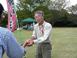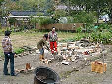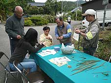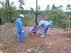 | 10月27日(土) 美味しい魚を育てる森づくり 能登町で行っている「美味しい魚を育てる森づくり」に参加。朝6時に家を出て、集合場所には8時半には着いた。9時にオリエンテーションを行い、会場の山の中に移動。作業開始時には雨も上がってちょうどよい感じでした。1人10本以上のケヤキを植栽。作業後、「なごみ」に戻り、森林インストラクターの中栄義威氏より森の話しをうかがう。午後からは読谷村商工会ご一行の視察研修におつきあいする。まず、数馬酒造で酒蔵を見学し、数馬さんから能登ネットワークの活動についてお話しをしていただく。次に、「さんなみ」にも寄り、ご主人に会っていただきました。沖縄に欲しいのは「さんなみ」のような民宿ではないかと感じています。和倉温泉泊でしたので、前日から同行してくれている濱さんと一緒に泊まる。沖縄の人らしく、11時過ぎから温泉街に出かけ、「きつねとたぬき」に行く。貸し切り状態で楽しませていただいた。食べそびれたが突き出しの茶碗豆腐が美味しそうでした。 | ![]() 森づくり活動 |