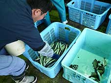 | 10月15日(月) 民宿せがわ 明日の講演のために、能登島に前日入りする。向田の交差点のところにある民宿せがわさんに泊めていただき、能登島の民宿の今後について意見交換する。いろいろな魚貝を活かした料理を楽しませていただきながらの議論は12時近くまで続きました。ご子息が横浜の寿司屋で修行中とのことですので、将来展望を描く楽しみもあるというものです。翌朝は朝6時に宿を出て、逍レ漁港に行き、魚の荷捌きの様子を見学させていただく。その場で魚を買うことができるのは素晴らしい。案山子窯の山田さんも買いに来ておられました。水揚げされ動いていたサバを刺身にして下さいました。贅沢な朝食です。