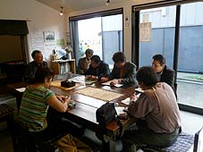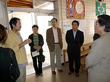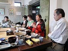 | 10月28日(日) 読谷村商工会視察研修 和倉温泉を9時に出発し、能登島へ。まず、ガラス工房で佐野さんより説明を受け、見学。古い校舎を使っているので、維持管理が大変そうです。最近は経営も軌道に乗ってきているようだが、震災で多くの商品が割れ、お客様が減っていることが痛手になっている。その後、案山子窯にお邪魔し、山田さんから説明していただく。海側のベランダからの眺めは皆さんに気に入っていただけました。『能登人』を訪ねる旅のようでしたね。昼前には七尾に移り、食祭市場を見学。いしり亭でいしり鍋を中心にした昼食をいただきながら、森山奈美さんから、七尾のまちづくりのお話をうかがう。その後、一本杉通り商店街の「お茶の北島屋」の北林さんより商店街の活動について説明を受け、商店街を歩いて見て回る。きもの処 凛屋、高澤ろうそく、白井昆布、鳥居醤油、最後に北島屋さんと見学し、それぞれお話をうかがう。最後は小松空港までご案内して見送る。珍道中でしたが、楽しい出会いでした。読谷村の皆さん、ご協力いただいた皆さん、ありがとうございました。