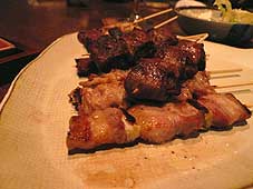 | 10月19日(金) 十兵衛 夜は錦町の「焼鳥料理十兵衛」という店に初めて行った。錦町のバス停(専用の駐車場もある)のそばの辰巳用水遊歩道を少しだけ上の方に歩くとある。カウンターが厨房側と外側に向けて設けてあり、窓の外には犀川に沿った街を眼下に見下ろすことができるようになっています。本当に崖の上に立っているお店です。「お酒と料理と景色の美味しい店」とショップカードに書いてあったが、その通りの店でした。小上がりもあって、家族連れでも大丈夫ですね。 | ![]() 十兵衛の焼鳥 |