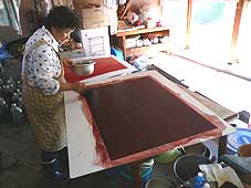 | 10月2日(火) 加藤和紙 加賀からの帰りに、寺井のたけもと農場に寄り、新米をいただく。久しぶりにご主人と話す。最近は若手が仕事をこなしてくれるようで、コンバインに乗らないことも多いようだ。世代交代は徐々に進んでいる感じです。その後、川北の加藤和紙さんを訪ねた。何度も取材で訪れているので、お母さんやお嬢さんからお話を何度もうかがっているし、一連の工程も取材させていただいています。それらも踏まえて、産業観光について打ち合わせ。お母さんの語りは魅力的ですので、それをコアにプログラムを考えたいものです。 | ![]() 和紙に色をつける |