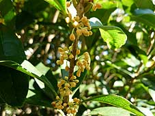 | 10月6日(土) キンモクセイ 事務所の前の公園に植えてあるキンモクセイの花が膨らんできています。独特の香りがただよい始めていますので、近所の木は咲いてきているのでしょう。金沢はキンモクセイを庭に植える活動をしてきていますので、たくさん植えられています。事務所の近くに大きなキンモクセイの木がありますし、お隣の家にも植えてあります。家を買った時に、金沢市から植木の券があたり、それでキンモクセイを我が家の庭にも植えました。キンモクセイは秋を告げる特徴のある花ですね。 | ![]() キンモクセイ |