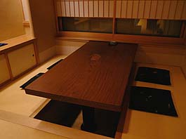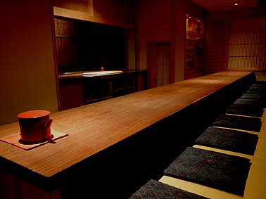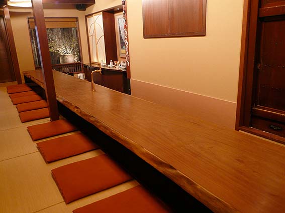 | 10月29日(月) まいまい 今日は東山の茶屋街にある「まいまい」(金沢市東山1-12-12 TEL 076-251-7878 19:00〜24:00 日曜・祝日は休業、事前にお電話下さい)という和風バーに撮影に出かけた。東山の茶屋街のメインストリートの左側の裏通りにあります。広見の柳の前にある「蛍屋」を巻くようにして裏手に入っていくと分ります。以前は片町で店をされていた女将が開いたお店です。メインは大きく長い一枚板のカウンター。これも元田銘木(白山市湊町巳8-1 TEL 076-278-3367)さんが納められたものです。あまりにも長かったので、一部はカットして自室のパソコン用テーブルに使われているとのこと。一枚板のカウンターはお客様とのコミュニケーションに好都合な存在で、高く評価されています。カウンターの正面には大きなガラス窓があり、明かりの入った中庭を眺められます。入口を入ったところには小さな空間もありますので、4人までのお仲間で楽しみたい時はこちらがおすすめかもしれません。このコーナーにも一枚板のテーブルが設置されています。すべて、足を下ろすことができます。全体にシンプルでさっぱりとした空間です。陶芸もされる女将さんの美意識が表われているようですね。お代は5000円からとのことです。食事も予約制で用意されますので、落ち着いた雰囲気の中でいただくには絶好の場かもしれません。女将さんとは以前から面識がありましたが、今回ゆっくりお話をうかがい人柄の良さがよく分りました。おすすめです。