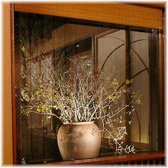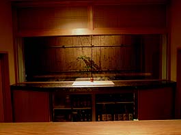 | 10月25日(木) すが野 西の茶屋街にある「すが野」(金沢市野町2-25-21 TEL 076-245-0006 19:30〜24:00 日曜・祝日は休業、事前にお電話して下さい)という和風バーに撮影に行きました。夕方、電話が通じ、今日でもよいと言われたので早速出かけた。事務所から歩いて10分程度のところにある西茶屋街であるが、最近はお茶屋さん以外のお店が徐々に増えています。そんな茶屋街の真ん中にあるのが「すが野」さんです。芸妓のご出身ではありませんが、芸事は習っておられるようで、三味線が置いてありました。築100年にはなるという建物を改装して、1階に一枚板の長いカウンターが設けられ、足をおろして座れるようになっています。多くのお客様も感心されるそうです。奥の中庭は額縁のような窓を通して眺められ、大きな瓶に花が生けられています。素晴らしい空間です。女将さんも美しく愛想の良い方です。お代は5000円からとのことですので、どなたかお客様が見えられた時にでも、一度お客として訪ねてみたいものです。空間だけでも一見の価値は十分あります。いい出会いでした。大きな一枚板のカウンターは元田銘木(白山市湊町巳8-1 TEL 076-278-3367)さんが納めておられます。